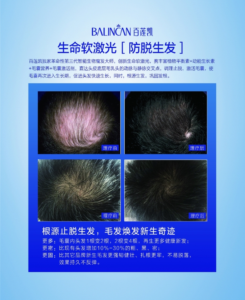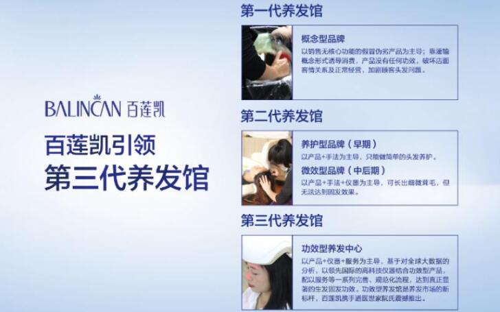 百莲凯养发馆是百莲凯集团旗下的功效型养发品牌,专注防脱育发、白发转黑等等问题头皮,以独家高科技仪器第三代智能生物魔发大师,配以国粹“道医”秘方,为头皮提供功效型健康养发服务。